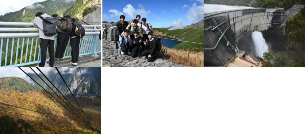 2日目は立山黒部アルペンルートを富山側から長野側へ移動しました。バスが進むにつれて山々の景色が紅葉へと変わりゆき、標高が上がるにつれて植生がかわることを観察することができました。黒四ダムでは、事前に『プロジェクトX』を見て学習していたこともあり、完成までの人々の苦労を重ね合わせて見学することができました。