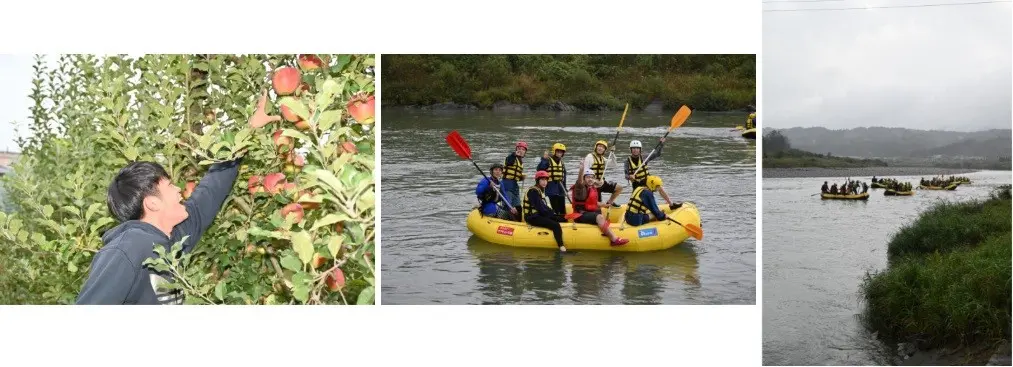 3日目は長野県飯田市内でリンゴ狩りと天竜川のラフティング(川下り)を体験しました。天竜川の川下りは江戸時代の物資輸送に由来するレクレーションだそうです。また、リンゴ狩りでは「信濃スイート」という品種をカゴいっぱいに収穫しました。小雨模様ではありましたが、無事にプログラムを進めることができました。今夜は昼神温泉郷で宿泊します。